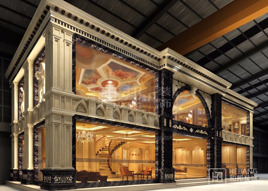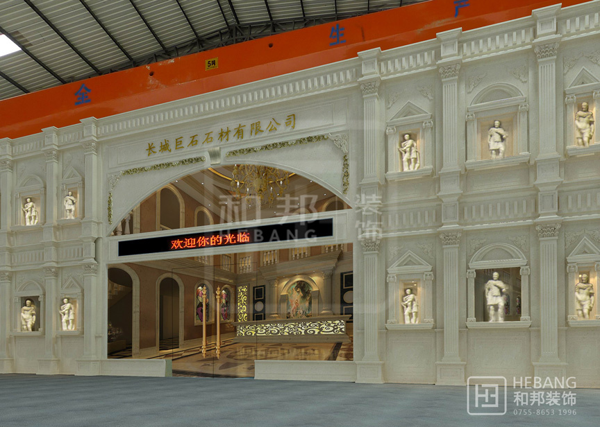 整個展廳全部使用石材來裝飾:從外到內(nèi)無不使用石材來設(shè)計,很好地體現(xiàn)了展館的主題;同時,整個展館多使用圓形拱門非常具有設(shè)計感。