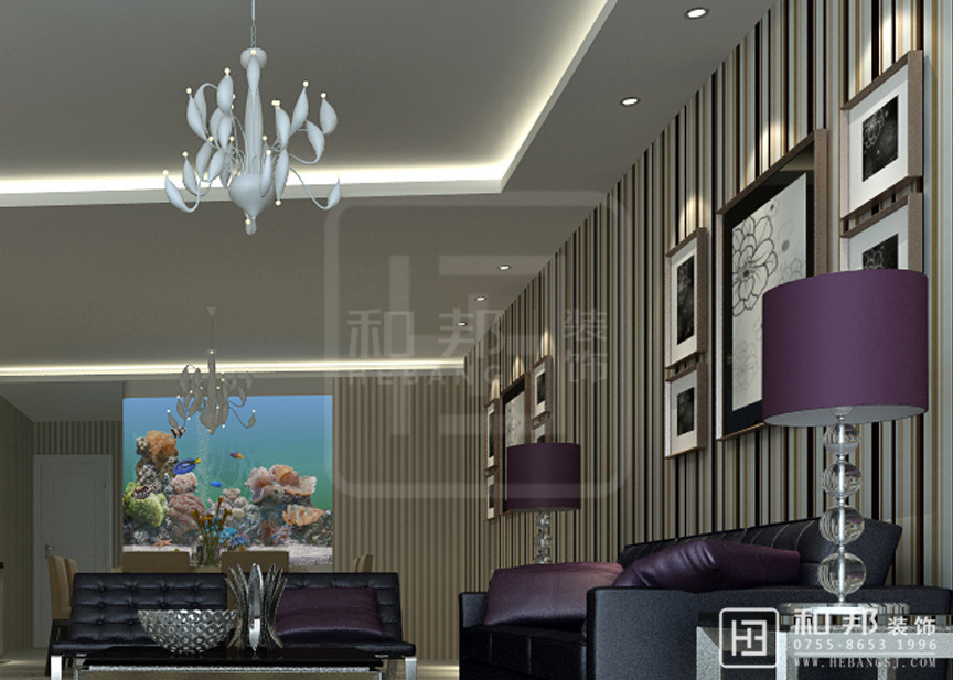 | 設(shè)計(jì)說(shuō)明 | 客廳的沙發(fā)墻面的線條與電視墻的墻面有著“天輕地重”的舒適視覺(jué)感,抱枕使用了紫色,與黑色沙發(fā)的相得益彰很舒適、溫和,這種裝飾效果形成對(duì)比的層次美感。 | ||||